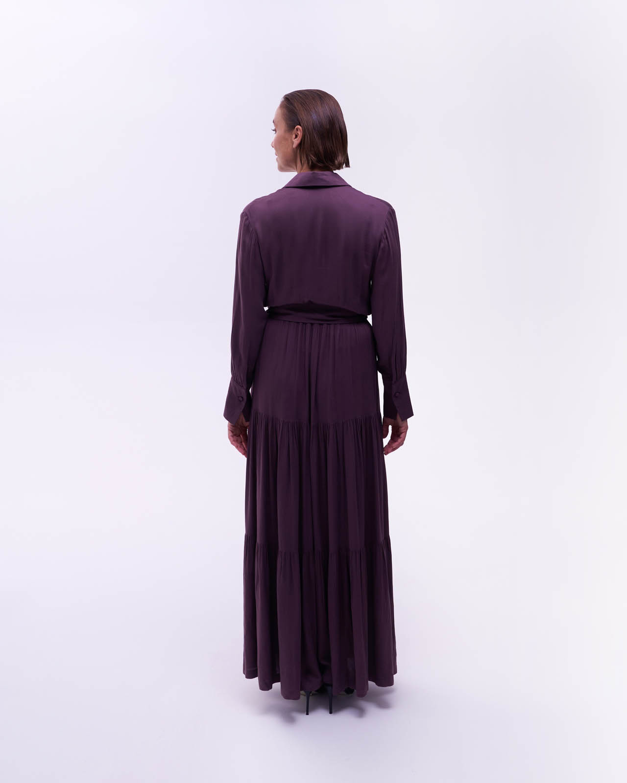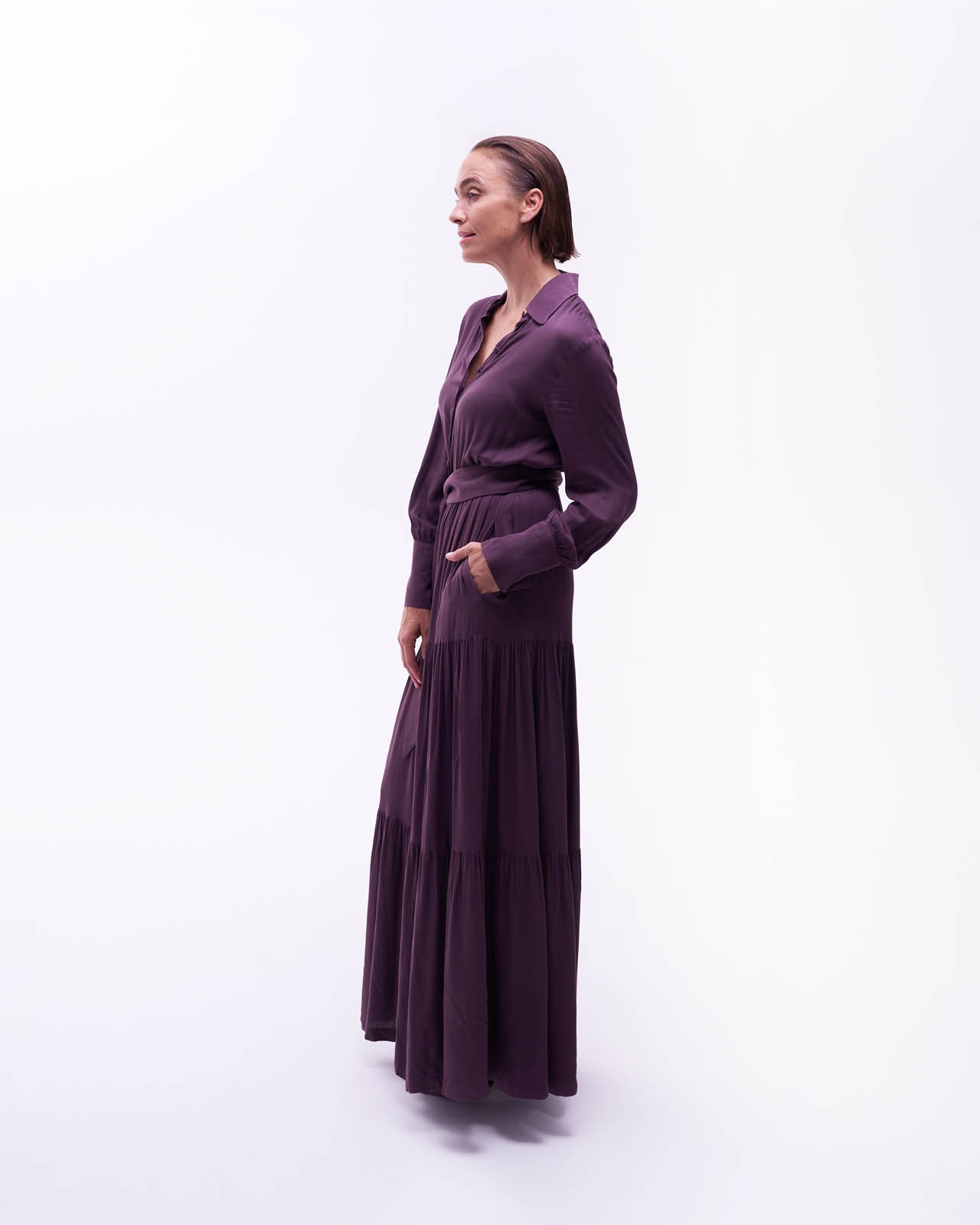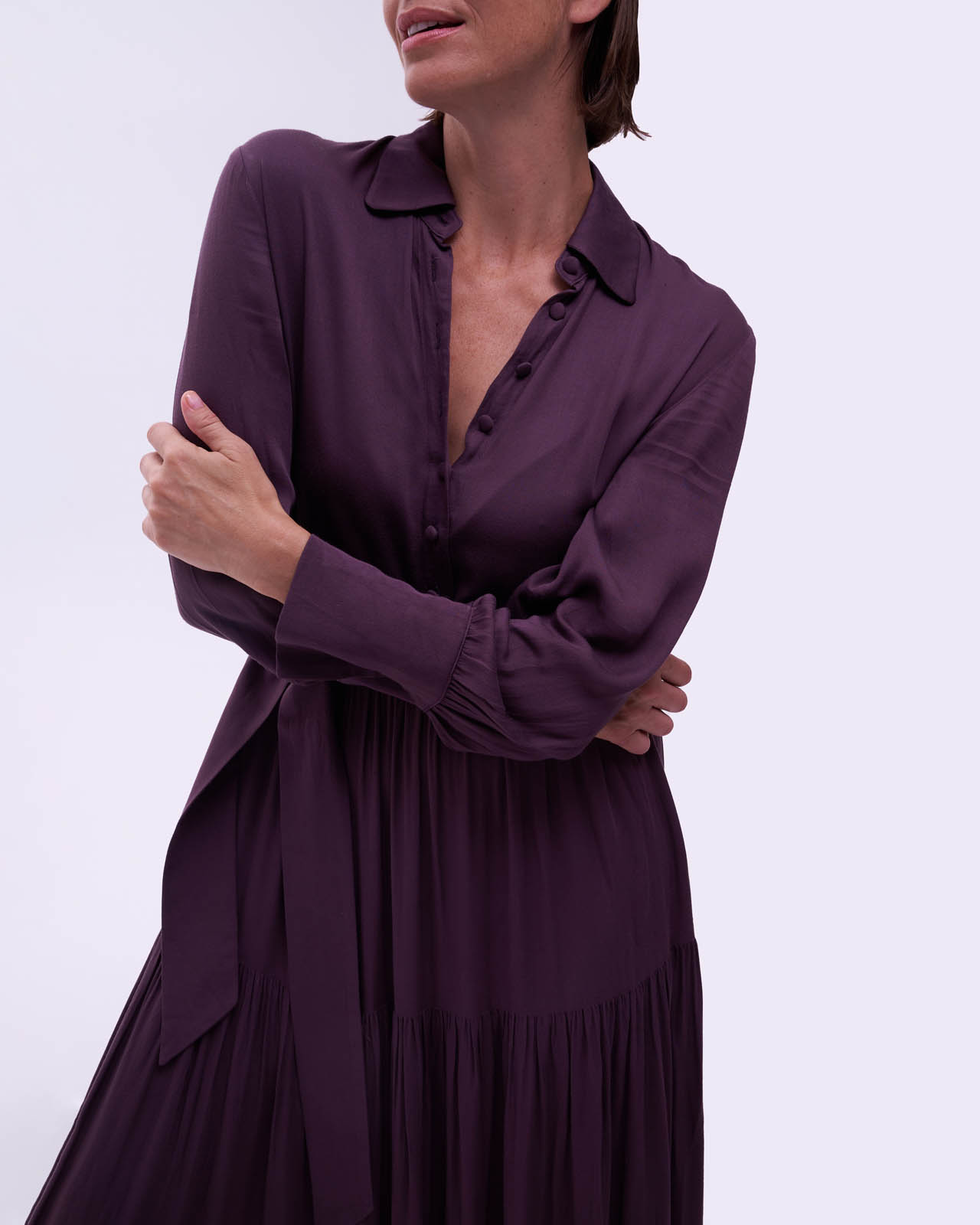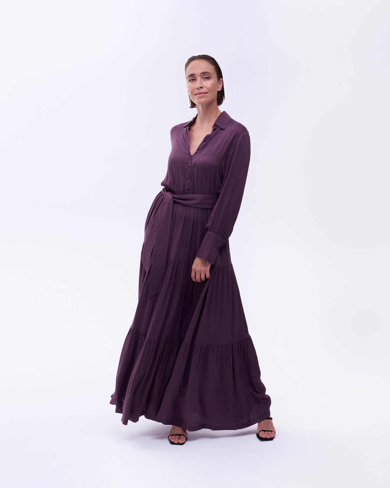Das Elodie Kleid ist aus schokoladenbrauner Viskose mit klassischem Kragen und flatterndem, gestuftem Saum geschnitten. Je nach Lust und Laune kann es ganz zugeknöpft – als bescheiden -, oder aufgeknöpft – frech – gestylt werden.